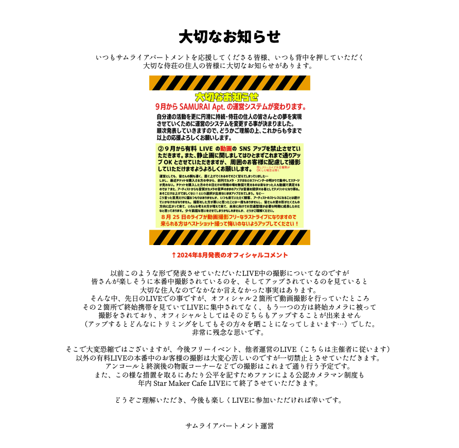 どうぞご理解いただき、今後も楽しくLIVEに参加いただければ幸いです。