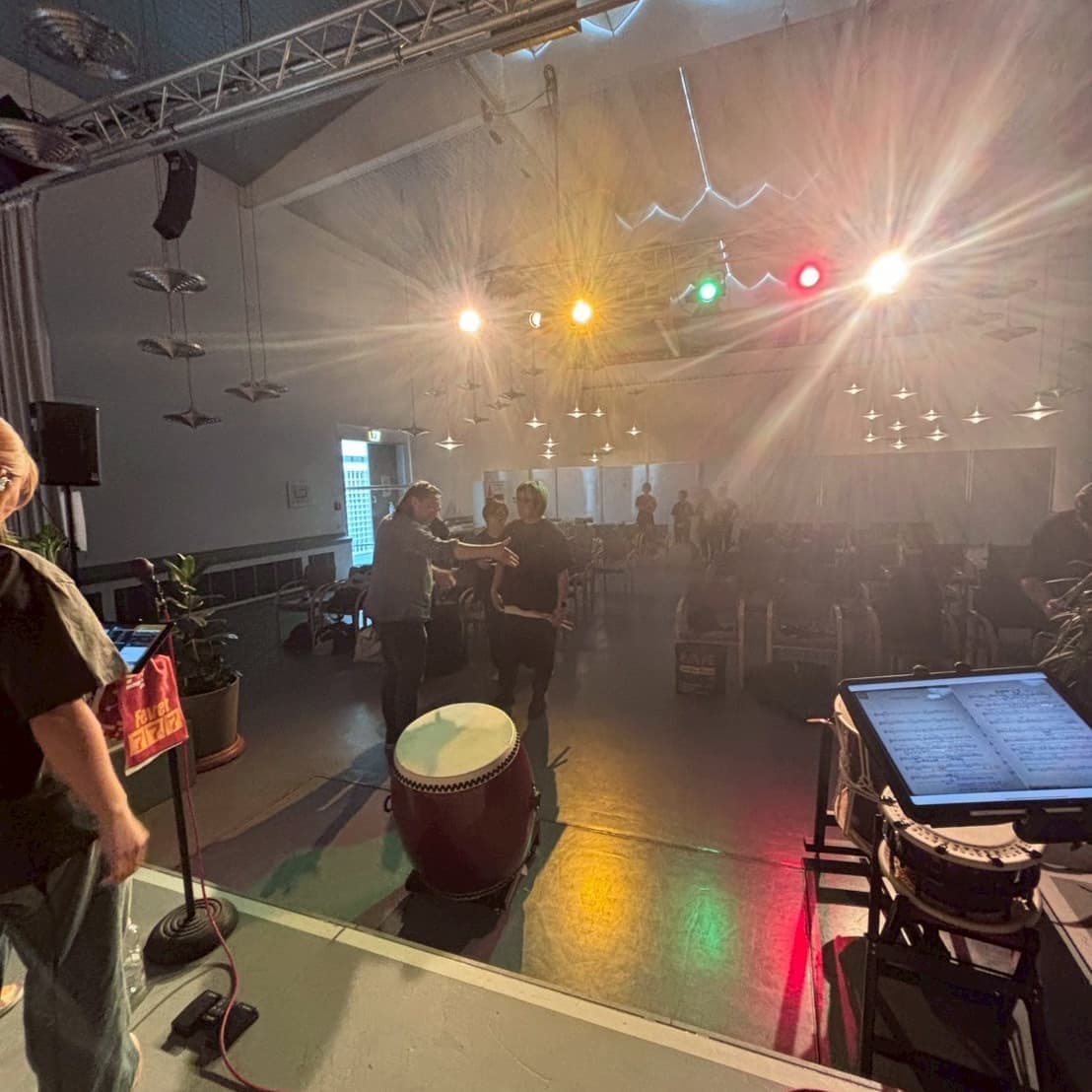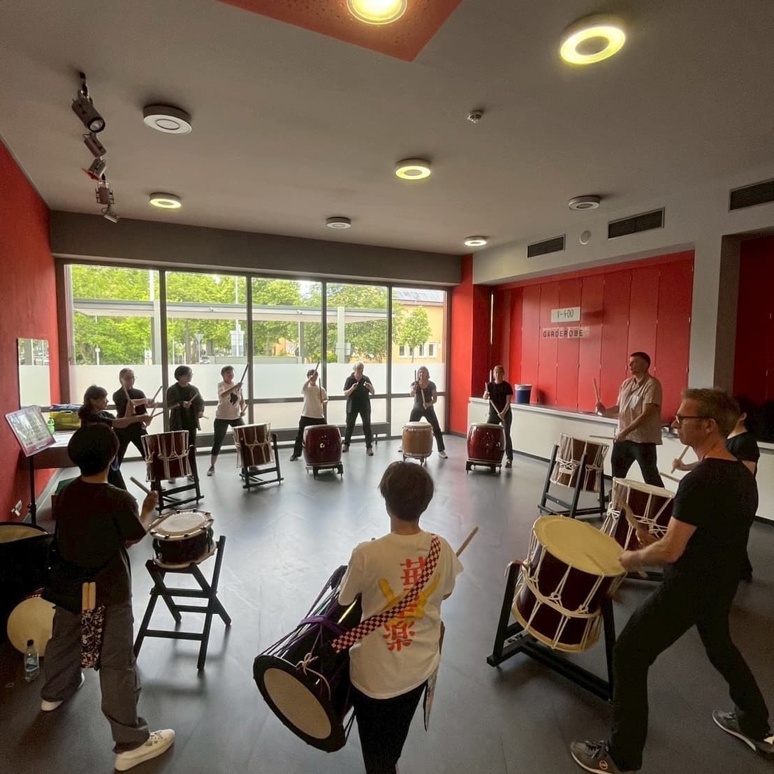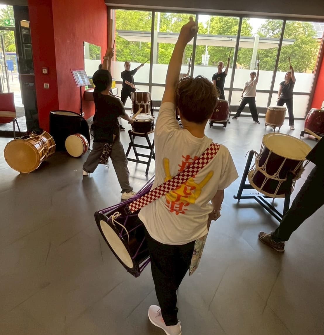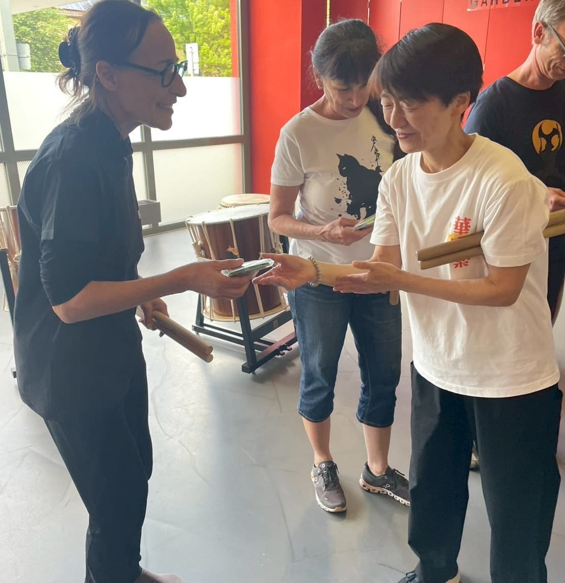 リハーサルと同時刻には蒼き風の民のメンバーは地元の天人太鼓の皆さんにワークショップを行ないました。いつか青い鯉のぼりの下で合同演奏できることを目標に合同曲をマスターしています!