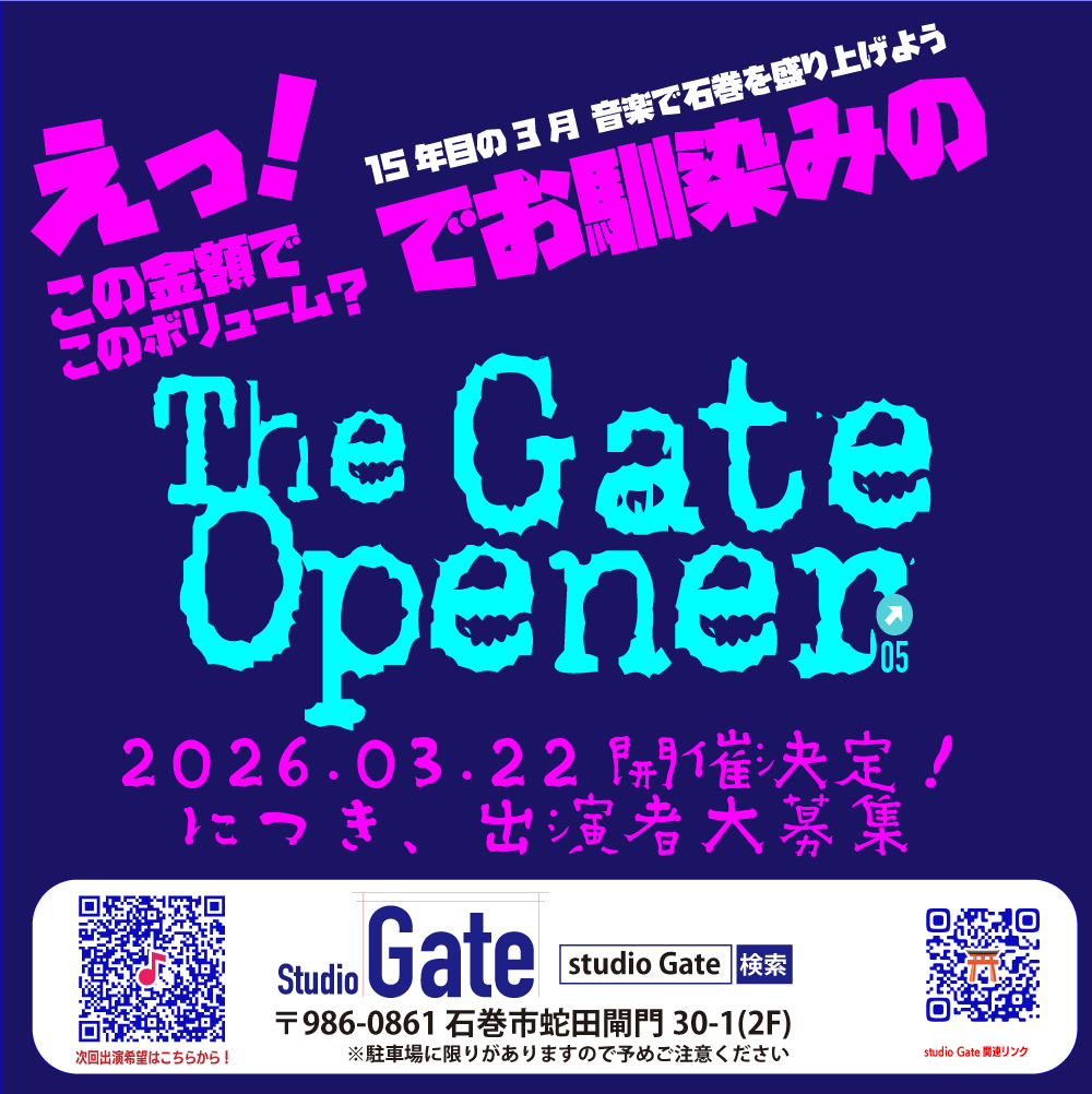 2025年 チャレンジをしたい表現者たちをジャンルを問わず集めて行う「Gate Opener」。回を重ねるごとに出演者も観客も増えて注目度もアップして来ました。ここでしか観れないアーティストもここGateの門をくぐり他でもたくさんのチャレンジを行いまたお客さんを連れてここに戻ってくる者達もおりり、ツアーで回るアーティストたちにも徐々に知られ始め、大御所たちも訪れるようになって来ました。